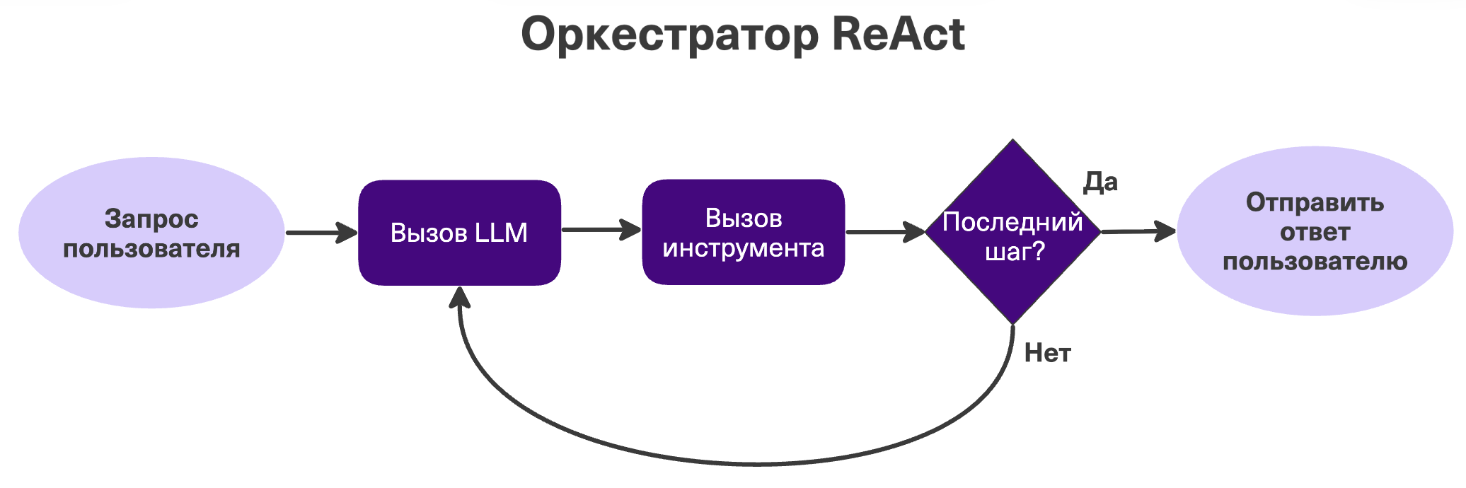 Самый базовый вариант автономного агента. Процесс заранее не зафиксирован. Модель работает в цикле: "Подумал → Выбрал инструмент → Получил результат". Здесь уже сама LLM решает, какой инструмент вызвать и когда остановиться.