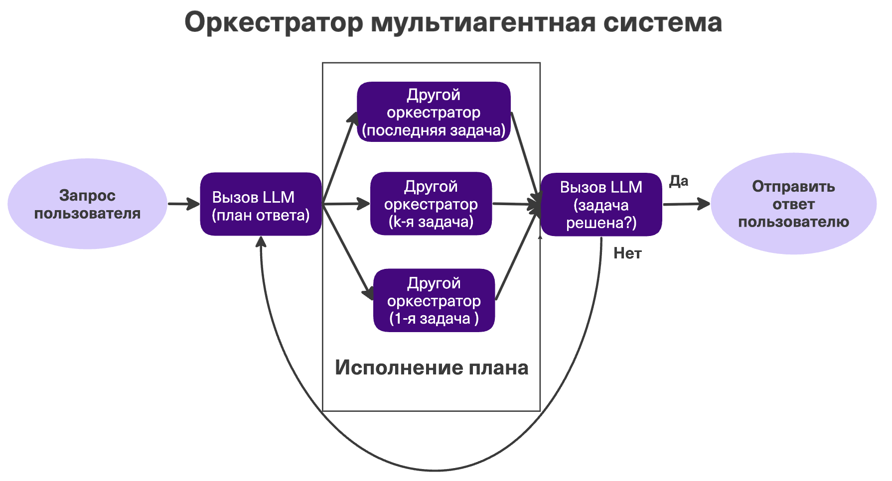 План создается как в прошлом пункте, но каждую задачу изолированно решает отдельный оркестратор (субагент). У каждого субагента — своя узкая задача и только необходимая для неё информация, они не делятся контекстом.