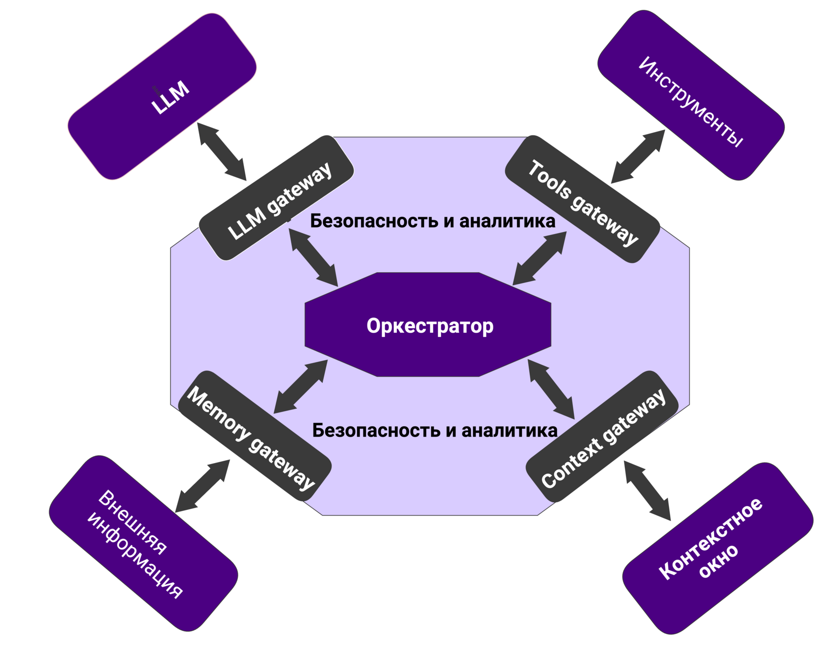 Всё взаимодействие функциональных блоков происходит через оркестратор. Но чтобы агент был безопасным и управляемым, мы помещаем оркестратор внутрь двух защитных слоев.