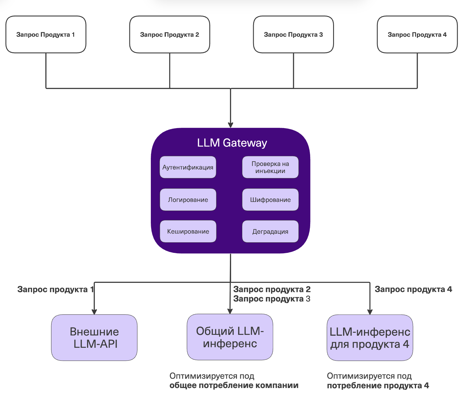 LLM для агента – это мозг, который принимает решений. В этом разделе обсудим, как должен быть устроен доступ к LLM в компании. Сначала приведу схему устройству, а затем в тексте его разберем.