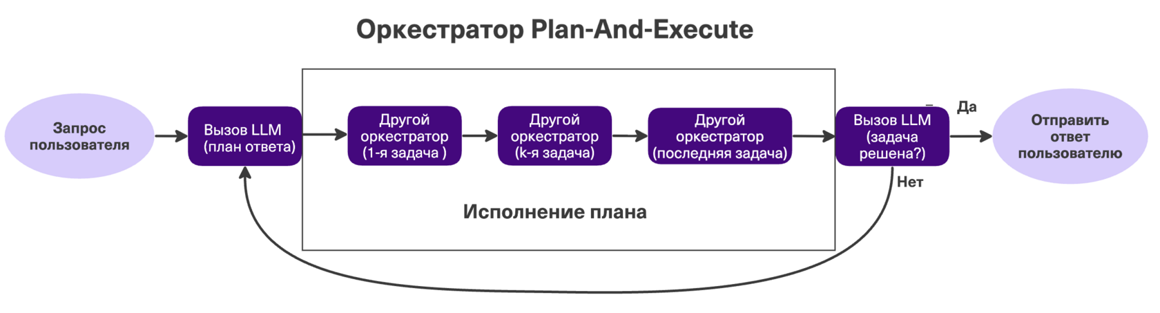 Сначала LLM составляет план, затем шаг за шагом другой оркестратор (например, Reflexion) этот план исполняет. Всё работает в едином контекстном окне. Как только план выполнен, LLM проверяет: задача решена или нужно составить новый план?