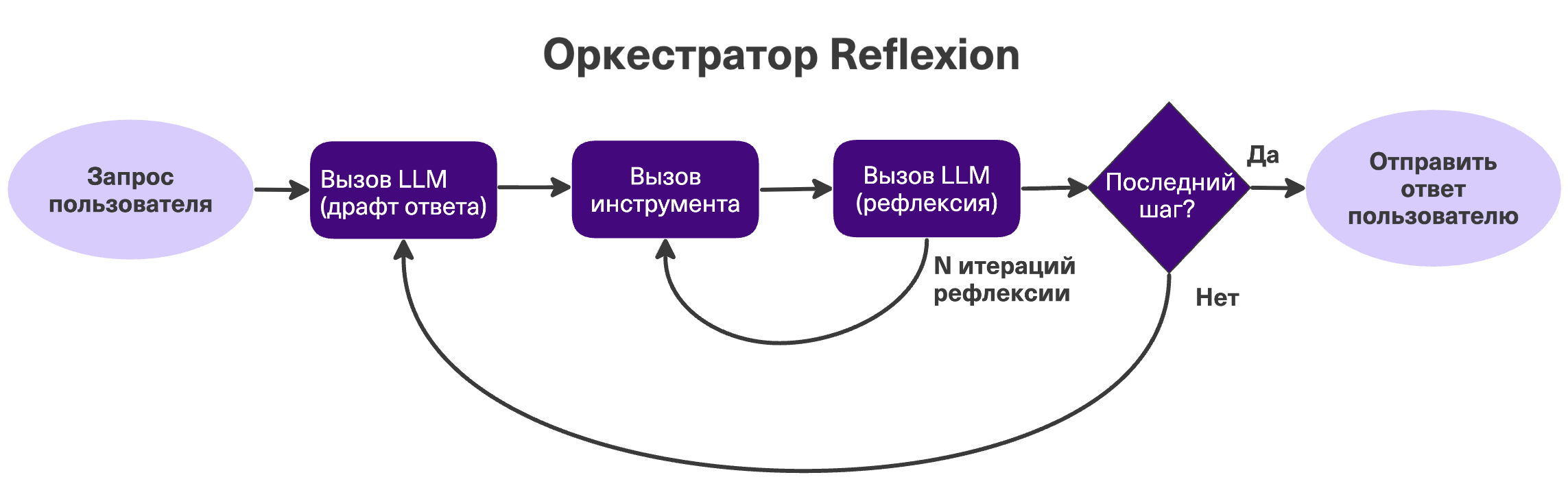 Умная надстройка над ReAct. В цикл добавляется этап "Рефлексии". Агент получает результат от инструмента, но не бежит дальше, а оценивает: "А то ли я сделал?". Если нет — пересматривает ответ. И так может делать несколько раз для одного действия. Мой любимый паттерн, я тоже мнительный :)